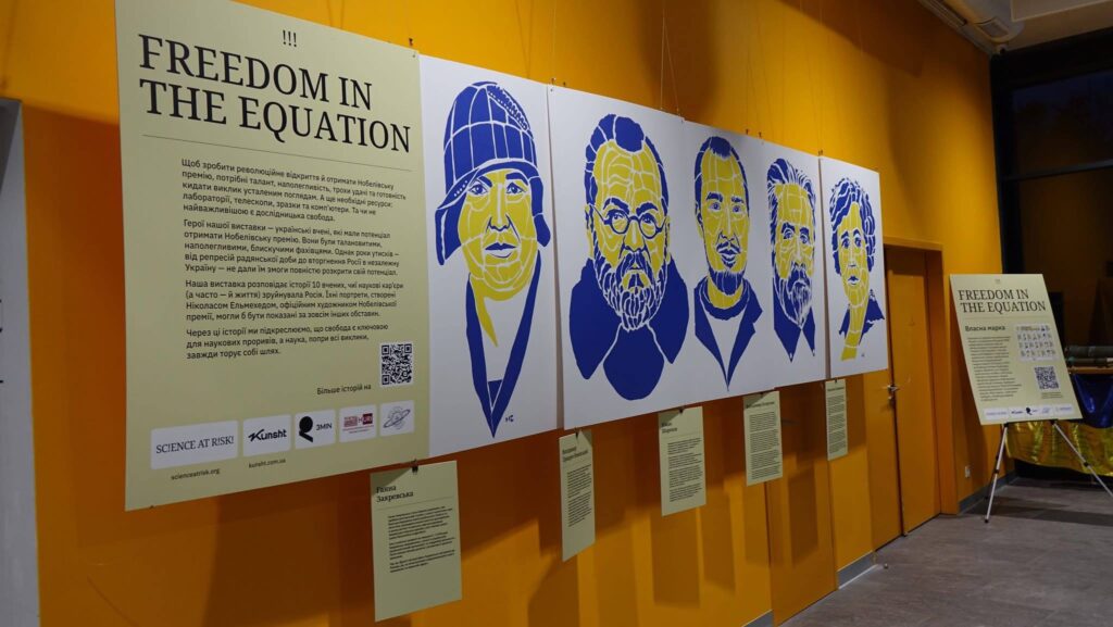 Це виставка про долі українських науковців та науковиць. Вона складається з портретів, створених офіційним художником Нобелівського комітету Нікласом Елмехедом.