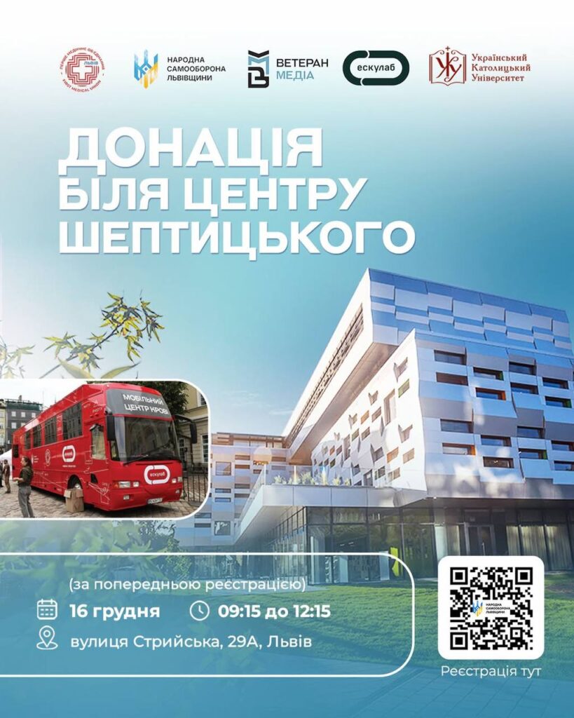 У вівторок, 16 грудня, біля Центру Шептицького, що на вулиці Стрийській, 29А, відбудеться забір крові в мобільному центрі.