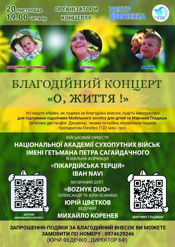 20 листопада, у День захисту дітей, у Центрі Довженка відбудеться благодійний концерт «О, Життя!», який організовує благодійний фонд «Із янголом на плечі». Захід покликаний допомогти дітям з рідкісними захворюваннями, які перебувають під опікою Мобільного хоспісу для дітей Центру дитячої медицини, що на вул. Дністерська, 27.