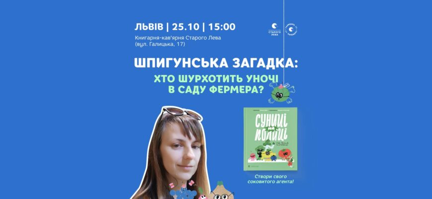 25 жовтня о 15:00 у книгарні-кав’ярні Видавництва Старого Лева (вул. Галицька, 17) відбудеться творча подія для дітей за мотивами книжки «Суниці на полиці та інші шпигуни» письменниці Уляни Чуби — авторки зі Сихова.