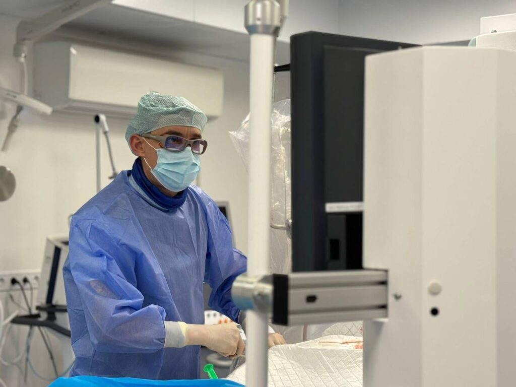 Хірургам потрібно було якомога швидше відновити кровотік. Для цього вони завели в судину катетер, доправили стент і розширили ним просвіт артерії.