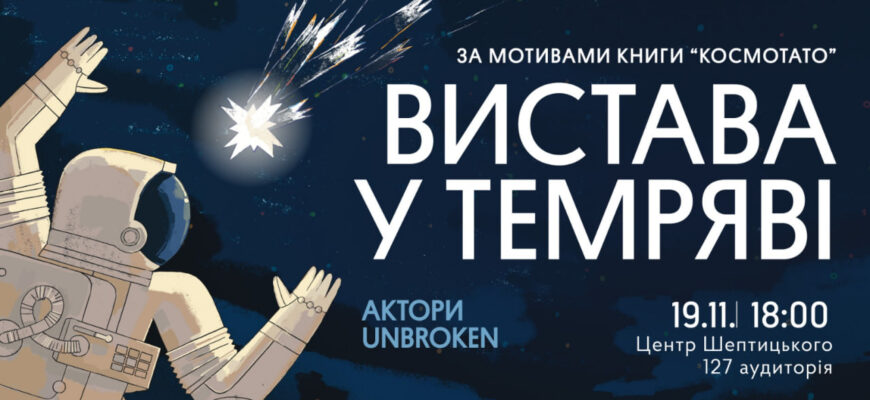 19 листопада о 18:00 у Центрі Шептицького (127 аудиторія) відбудеться унікальна вистава у темряві. Постановка заснована на книзі Вікторії Задорської «Космотато» і розповідає про те, як переживати горе втрати, як говорити про смерть і відсутність з дітьми, та як бути поруч із тими, хто втратив близьких.