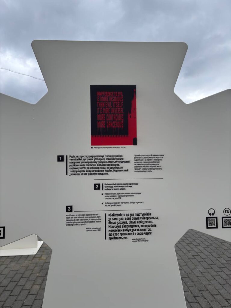 “Після багатьох ганебних компромісів та спроб домовитися, людство, опинившись на краю прірви, знайшло в собі сили об’єднатися для знищення гітлерівської диктатури та провести міжнародний судовий процес над великою частиною нацистських злочинців. Цивілізований світ справедливо визнав Голокост, який коштував життя мільйонам євреїв, чи не найжахливішим злочином, що не повинен повторитися. Водночас цей же цивілізований світ прийняв, як абсолюьно нормальні речі, співівснування та ведення величезного бізнесу з Росією, яка Голодомором, терором та іншими геноцидними атаками знищила мільйони українців”
