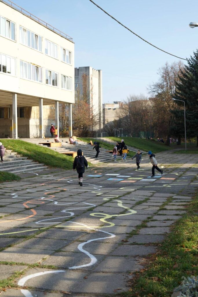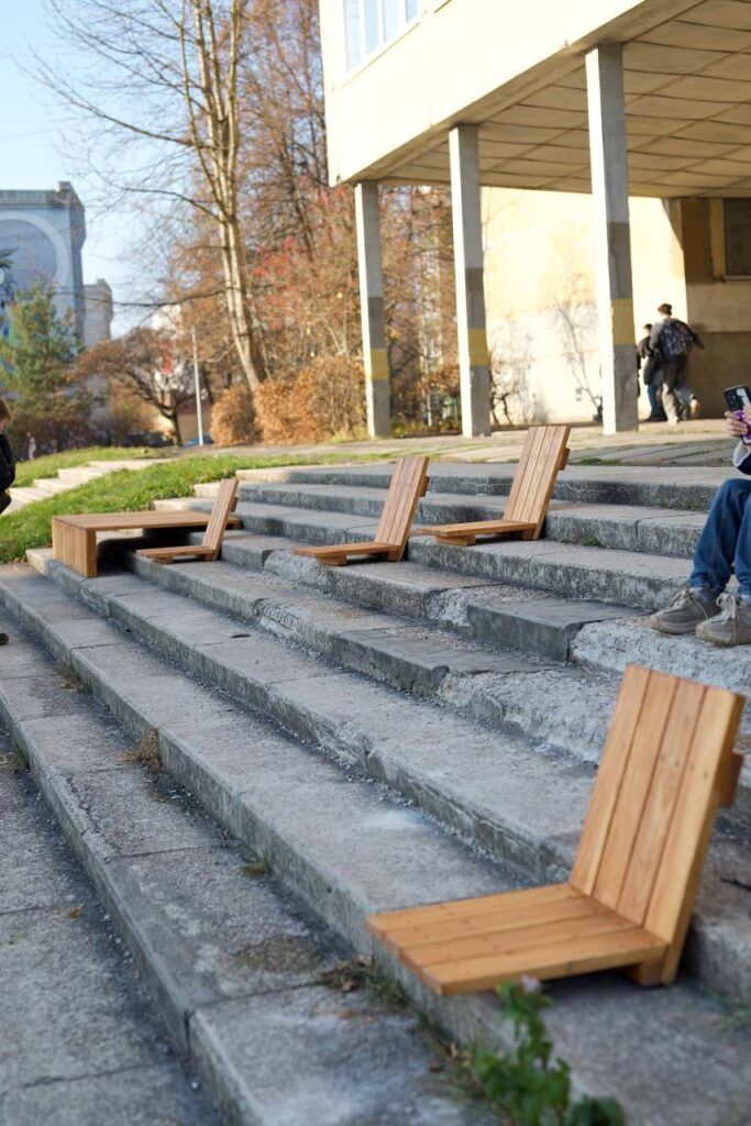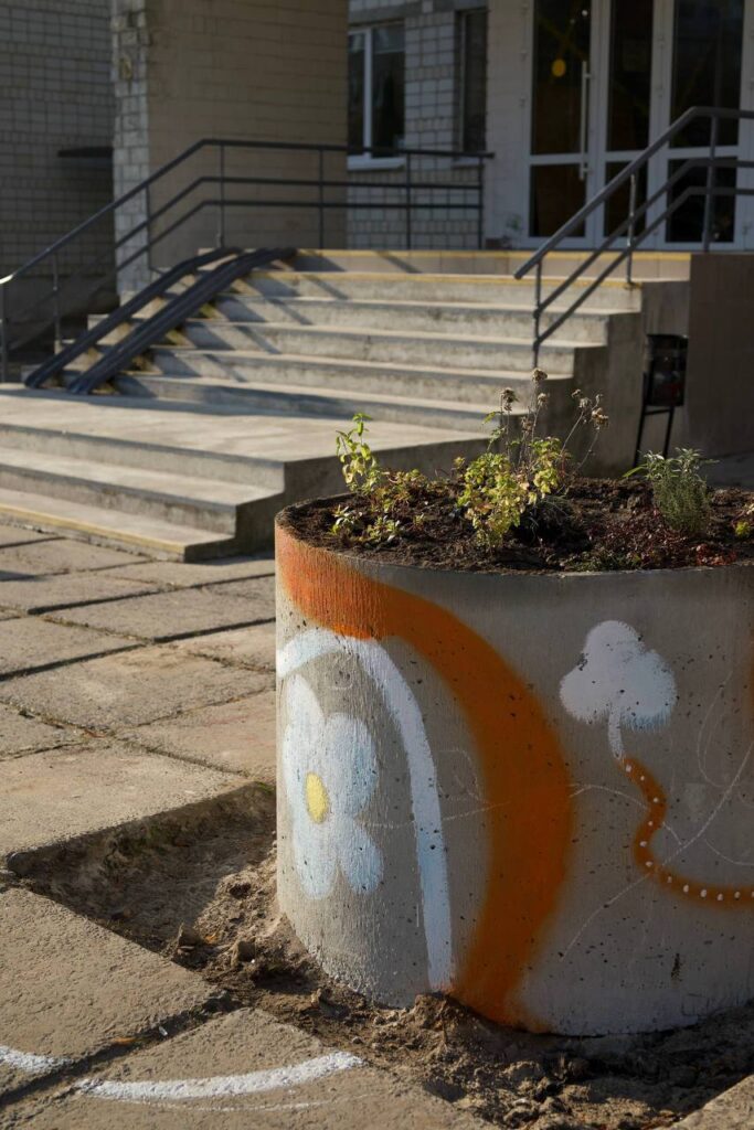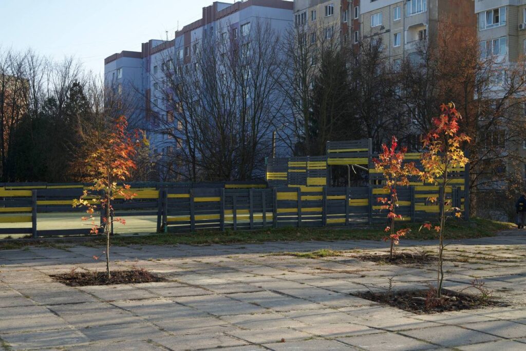 Серед них – зона відпочинку на сходах із дерев’яними лавками, невеличкий дитячий майданчик з гойдалкою та натягнутою сіткою, розмальований фарбою простір, клумби з молодими деревами та ігрові стільці з хрестиками-нуликами, де можна не лише сидіти, а й грати.